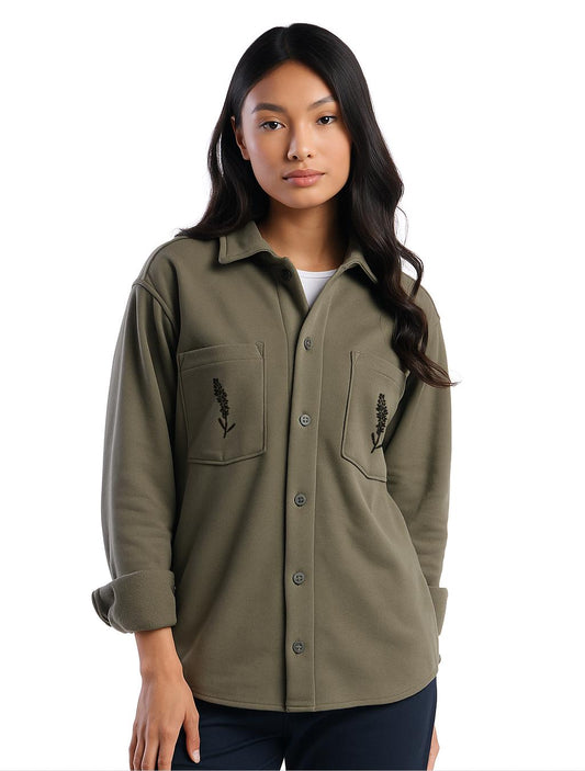 Organic fleece overshirt, fall shacket, unisex sage shirt jacket, button closure and block print pocket design, ethical fall fashion