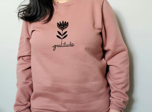 Gratitude sweatshirt, unisex hand printed flower crewneck, block printed floral illustration, soft fleece jumper, fall ethical clothing