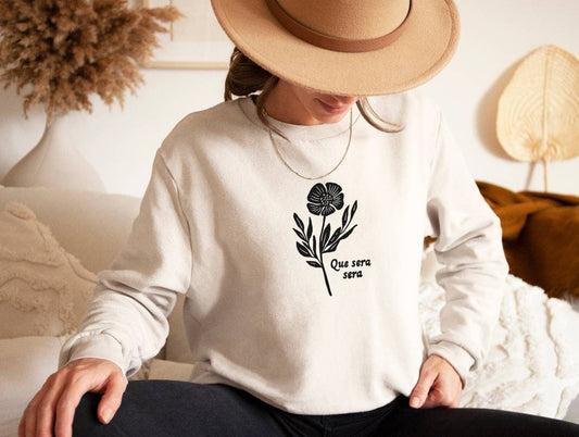 Que sera sera sweatshirt, bamboo UNISEX crewneck, french graphic floral print, natural organic coton sweater, hand stamped, ethical fashion