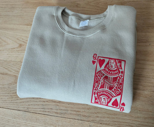 Queen of hearts sweatshirt, unisex hand printed sweater, red or black graphic, gift for her, vintage block print shirt, ethical fashion