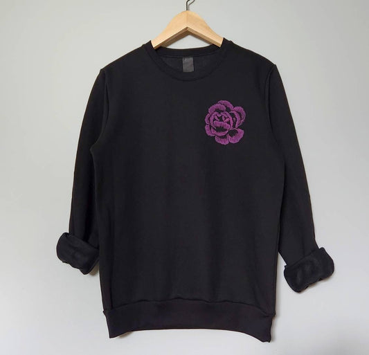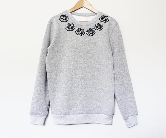 Rose sweatshirt, black roses print unisex crewneck, hand stamped minimalist floral collar pattern, lino print, gray sweater, fleece jumper