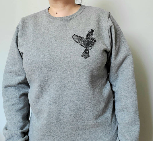 Bird sweatshirt, unisex hand printed crewneck, block printed sparrow illustration, soft fleece jumper, clothing, ethical fashion