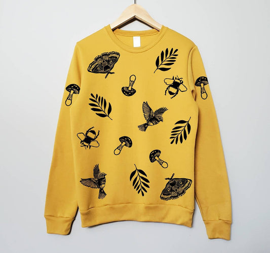Forest sweatshirt, hand printed unisex crewneck, enchanted forest cottage core design, unique block print, soft jumper, ethical fashion