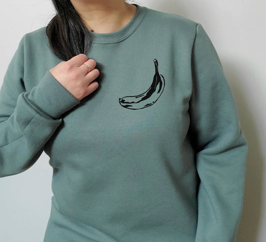Banana sweatshirt, hand printed crewneck, unisex style pullover, minimalist fruit print, white fleece jumper, lino print, ethical fashion