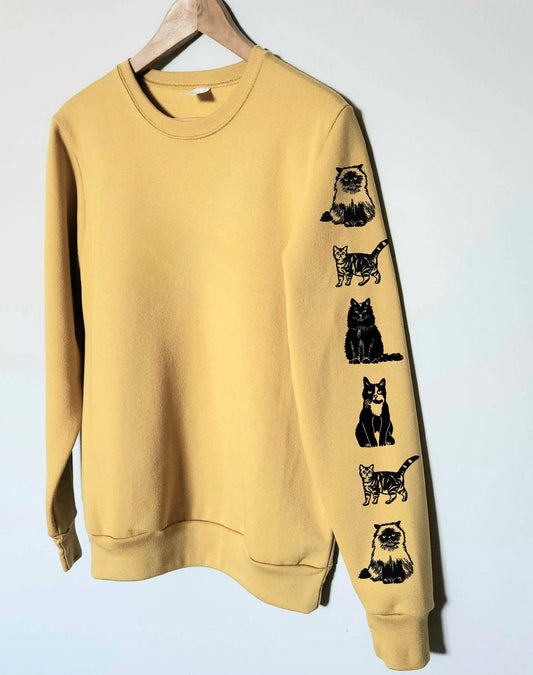 Cat sleeve print sweatshirt, hand printed unisex crewneck, cat print design, cat lover gift, block print soft cute jumper, ethical fashion