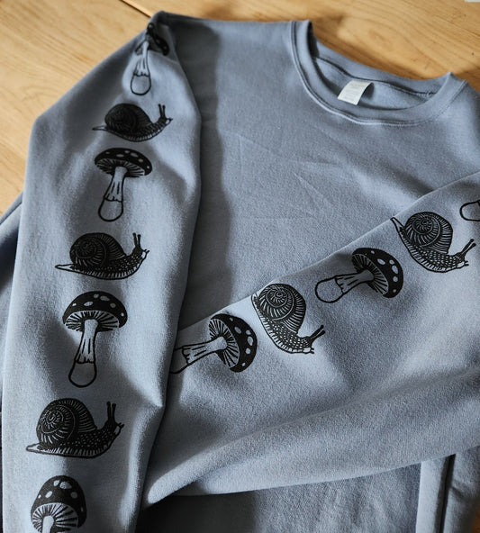 Snail mushroom sweatshirt with sleeve print, hand printed unisex crewneck, forest design, block print cottagecore jumper, ethical fashion