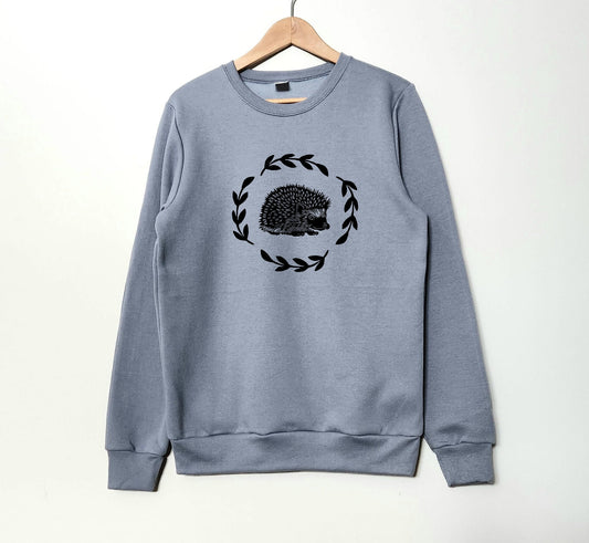Hedgehog sweatshirt, unisex hand printed crewneck, block printed cottagecore illustration, hedgehog and fern jumper, ethical fall fashion