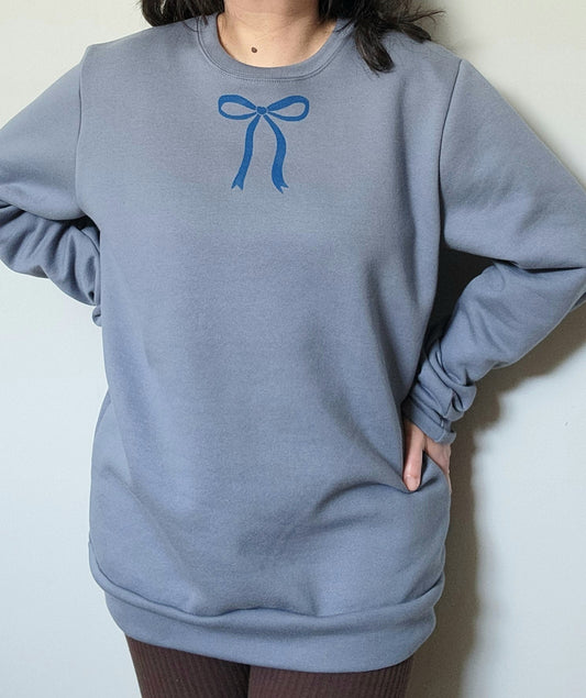 Bow sweatshirt, blue bow crewneck, hand block printed coquette ribbon illustration, cute jumper, gift for her, ethical spring fashion